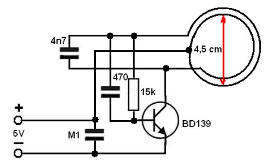 Na tomto obrázku je vidět jednoduché zařízení, vyrábějící elektromagnetické vlny, které se pak šíří prostorem k přijímači. Jeho zapojení je schematicky znázorněno na dalším obrázku. V podstatě je to obvod vyrábějící vysokofrekvenční kmity, tak zvaný oscilátor, osazený tranzistorem BD139 (nebo KD139), cívku jeho laděného obvodu tvoří dva závity silnějšího vodiče, která zároveň slouží jako (rámová) vysílací anténa. Celý obvod je napájen ze zdroje stejnosměrného napětí 5V, poslouží třeba i plochá baterie 4,5V.